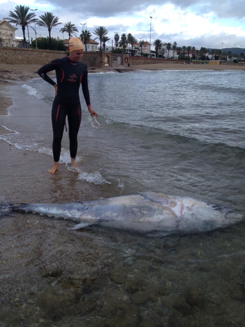 One thing I’m pretty good at is forcing myself to not think negative thoughts when swimming in the ocean. When Carrington waxes on about sharks or Emily flips about huge jellyfish, I usually say: “no, there’s nothing out there…. just us.” Well, this morning I discovered how flimsy my resolve for positive thinking really is. We walked out of the house down towards the beach and I saw it from 50 meters away: a mammoth, gleaming, dead fish. I walked over to it the whole time thinking: “holy crap- that’s the size of the fish out there!?” It was over 2 meters long and well over 100kg- bigger than me. We swam a short 3 K but I was terrified, more than I’ve ever felt before. A couple of times I ducked my head down so I could see if there was a leviathan fish nipping at my feet or if there was an giant eel attacking my neck. Thankfully, there never was (the eel was the wetsuit zipper cord, as Mauricio let me know after he heard my scream)… but I’m going to have to toughen up my thinking.