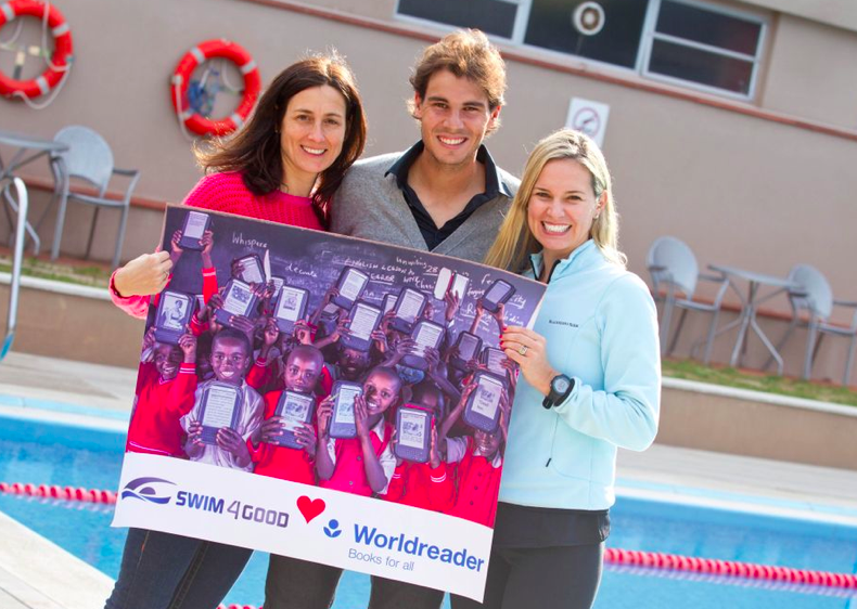 One of the amazing tennis players who trains there is none other than Rafa Nadal.  I recently finished reading “Rafa” and actually tried to extract some of his insane mental strength and put it towards my swimming.  That guy is a mental machine!  Yesterday Emily and I were lucky enough to share with him our plan to swim from Spain to Africa to raise money for Worldreader.