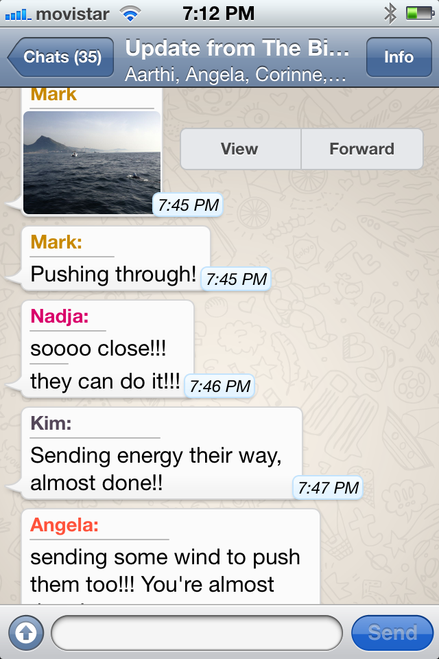 Although I did OK as bartender and cheerleader, one of the roles for which I was not really prepared was that of telephone receptionist. The swimmers were actually receiving phone calls on their mobile phones! Wasn’t expecting to have to take calls. Surely they were all from amigos just sending their support, but what if the call was from a telemarketer? “Hola! So sorry, but Mauro’s busy swimming from Europe to Africa right now. Can you, like, call back in 5 hours?” Unfortunately I did not have time to chat, so they received the impolite hang-up. Honestly speaking, there were many wonderfully supportive messages coming in from all over – from brothers, sisters, friends, workmates, famous swimmers, complete strangers – via email, sms, Whatsapp, Twitter, Facebook. From America to Zambia. Swim4Good would have had to cross the Strait and back – twice – to give me enough time to relay all of the messages that they had received.