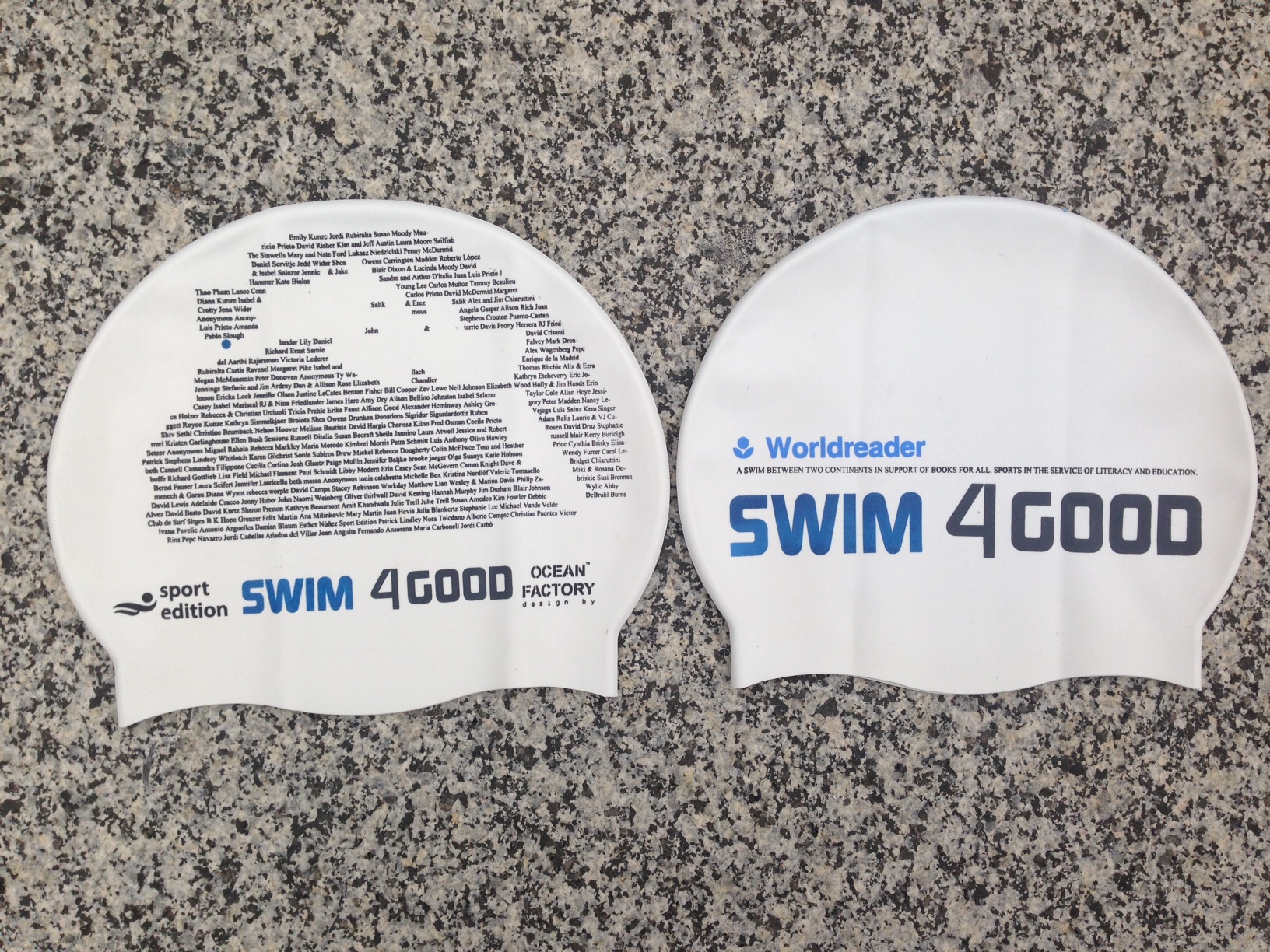 We finally received our new Swim4Good swim caps. One side of the cap shows a map (with a blue dot in the Strait of Gibraltar) that has the names of all the people who helped us reach $106.450 in donations to Worldreader. The other side of the cap has the logos of Swim4Good and Worldreader, as well as the following statement: “A Swim Between Two Continents in Support for Books for All. Sports in the Service of Literacy and Education“. Thanks to the Swim Factory in Barcelona for the design of the caps and to Sports Edition in Mexico City for producing them.