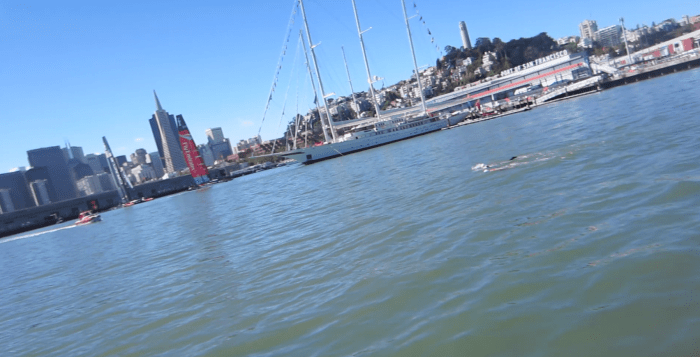 We swam past the Presidio and Crissy Field, past Pier 39, past Alcatraz….and then lo and behold, we swam right into the middle of the America’s Cup! The stands were filled with people waving NZ and USA flags and the Oracle Team USA and Emirates Team New Zealand boats were waiting to start the race 50 yards away from us. Our daughters were waving wildly to the crowd and apparently all the bystanders were cheering. Apparently Vito was being radioed by the America’s Cup organizers saying “What are you doing? Get out of there!” Vito replied: “I’ve got permission from the Coast Guard to get these swimmers through”