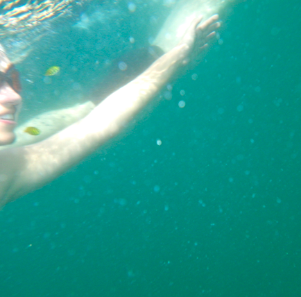 We continued and then the most amazing thing happened that I’ve ever seen under water. Okay- I know that limits things a bit, but go with me here. Lorea, who does many things- like writing novels— also doesn’t happen to swim on a regular basis in her hometown of NYC. She was feeling a bit discouraged with the currents and suddenly two friendly golden fish appeared under her nose, swimming frenetically towards something, guiding her to the end. She began to swim– unleashing a hardcore freestyle– with a huge smile on her face.