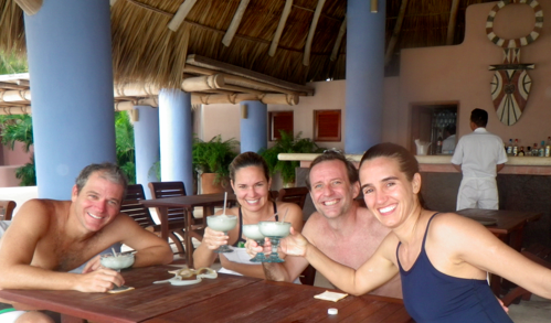 Today, Mauricio and I joined with our friends Dave Morgan and Lorea Canales and circumnavigated Punta Ixtapa- a 3.5 K in the Pacific. A bit of history: In 2007, the four of us barely knew each other and swam 4 km out and back to a craggly rock off in the distance in the Pacific in rough waters, something that at the time felt utterly insane. Extended family was freaked out about sharks. I’m not sure but I think that was the birthplace for Mauricio catching the OW swimming bug. Dave is an incredible athlete- played water polo at Penn State and Lorea- well, I just find her magical.
