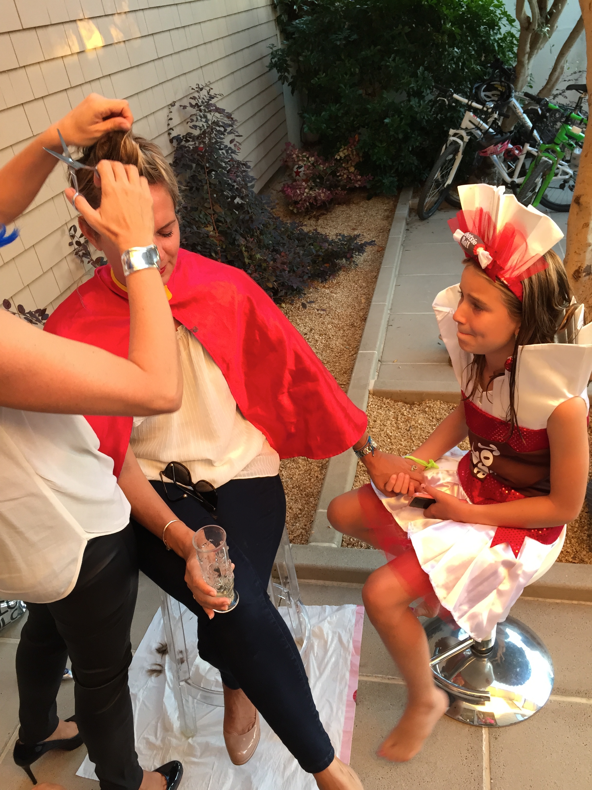 I assumed I’d go to a barber shop (because where else do you shear your hair off?), yet couldn’t imagine sharing such an intimate deflowering with someone I didn’t know. After talking to Mauricio and some friends, it became apparent: let’s take this into our own hands. Amanda, Evie and Maja showed up in wigs and brought a shaver and a super-hero cape for the client. Together with Mauricio, my daughters, my mother, Right Said Fred, killer heels and some champagne to witness, we shaved my head.