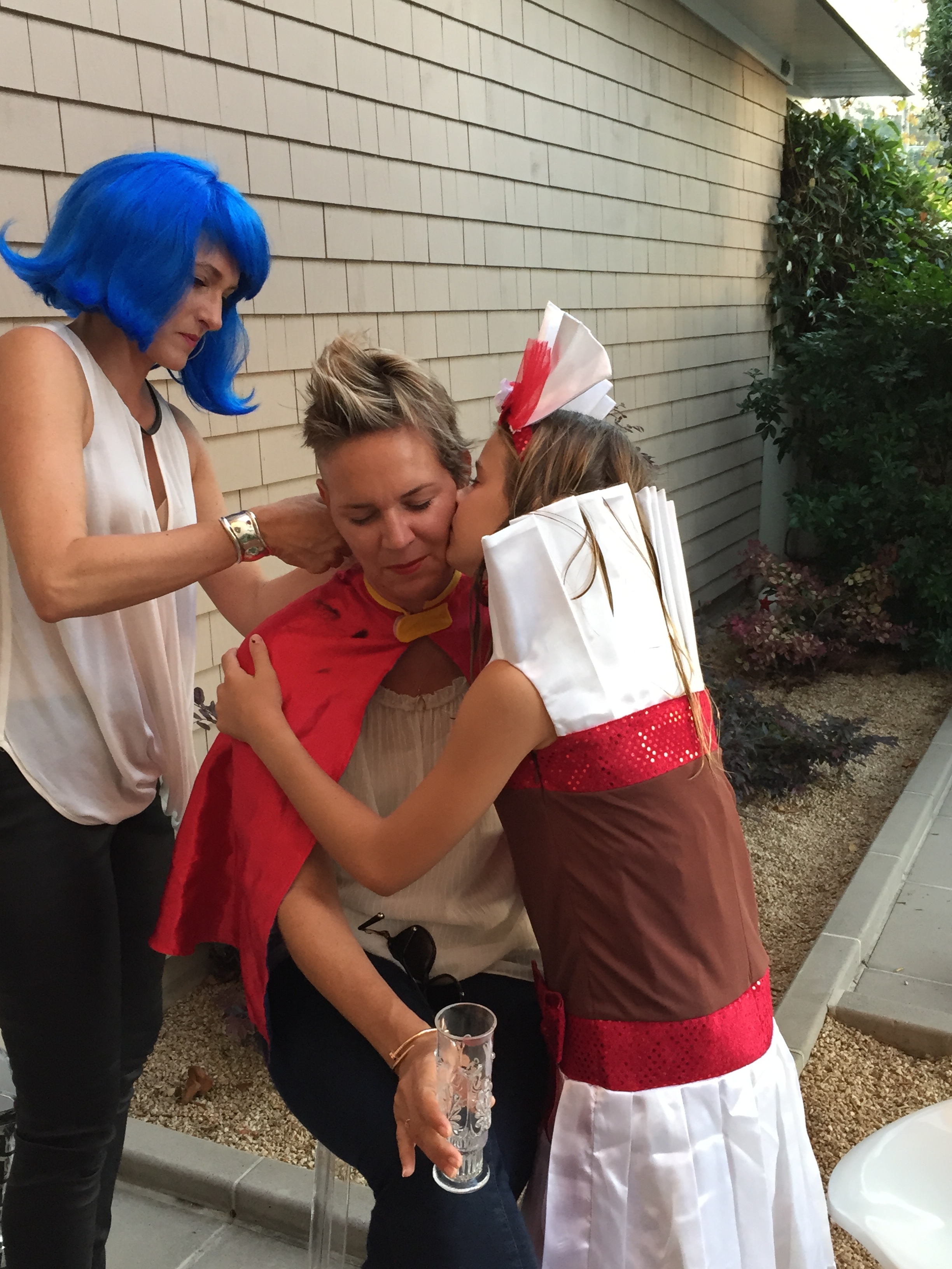 What I loved about this experience was how my daughters were there—and it morphed into a strange abstract sort of mirth. My youngest saw my friends in wigs and promptly put on her Halloween costume– a Tootsie Roll. During the buzzing, she territorially clamped onto my wrist, wincing. But once she saw that I was joking with my friends, she relaxed. When I finally opened my eyes and saw myself in the mirror I exclaimed: “Well, I’ve been wearing swim caps for half of my life– this isn’t too different.” Both my daughters surveyed the new exposed look, scanned my face for it’s true reaction and pronounced: “I kinda like it.” It was over.