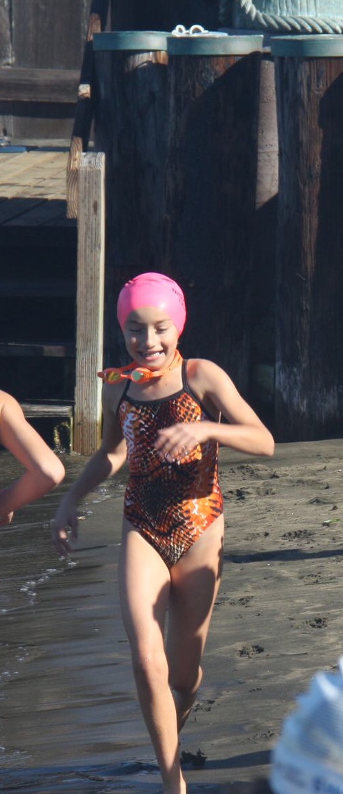 My name is Olivia. I have been swimming since I was six months old, but I started to swim competitively at age eight with North Bay Aquatics. I got my first JO time for 50 free in 2013 at 32:19. Open water swimming was introduced to me in early October of this year. I found a love for it because it wasn’t like swimming in the pool. It was a different experience that was always an adventure, not to mention how much colder it was! Swimming is good for me because it keeps me heathy and self motivated. The swim team matters, but in reality you are racing yourself. I like this because I can only compare my times or my progress to myself, and I am the only member on my team. In the near future, I want to swim from Alcatraz to the Dolphin Club. But, eventually want to swim the English Channel.